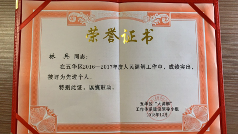 公司法務清欠部林兵榮獲五華區(qū)2016-2017年度人民調(diào)解工作先進個人稱號