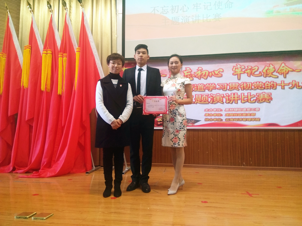 12月7日,由黑林鋪街道辦事處主辦的“不忘初心 牢記使命”演講比賽在云南經(jīng)濟(jì)管理學(xué)院舉行。公司推薦第八直管項(xiàng)目的李娜及公司信訪維穩(wěn)辦公室的陳坤搭檔演講的《瀾滄江為初心和使命作證》以全場(chǎng)最高分榮獲一等獎(jiǎng)。 本次演講比賽有來(lái)自各社區(qū)黨(總)支部、云汽實(shí)業(yè)有限公司、中國(guó)建材地質(zhì)勘察中心云南總隊(duì)、云師大商學(xué)院、云南經(jīng)濟(jì)管理學(xué)院、昆...