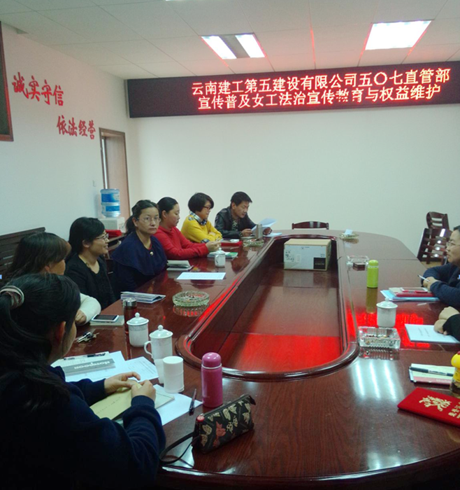 根據(jù)云建五工字〔2015〕11號(hào)文,關(guān)于開(kāi)展公司2015年女職工維權(quán)行動(dòng)月活動(dòng)文件的精神要求,五〇七直管項(xiàng)目部于3月24日早上10:00在直管部會(huì)議室組織全體二線女職工和部分一線女職工共12人學(xué)習(xí)普及了女職工權(quán)益保護(hù)法律法規(guī),使廣大婦女更多地了解法律,運(yùn)用法律武器保護(hù)自己的合法權(quán)益和特殊利益。 通過(guò)這次女職工維權(quán)行動(dòng)月活動(dòng)...