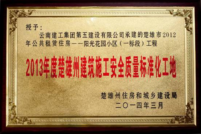 在2013年度楚雄州建筑施工安全標(biāo)準(zhǔn)化工地專家組核查驗收和州住房、城鄉(xiāng)建設(shè)局綜合評審中,由五〇三直管項目部施工的“楚雄市2012年公共租賃住房-陽光花園小區(qū)(一標(biāo)段)”工程項目,榮獲“2013年度楚雄州建筑施工安全質(zhì)量標(biāo)準(zhǔn)化工地”稱號【楚住建發(fā)(2014)56號文】。并于2014年5月6日正式授牌。 獲此殊榮,項目管理團隊...
