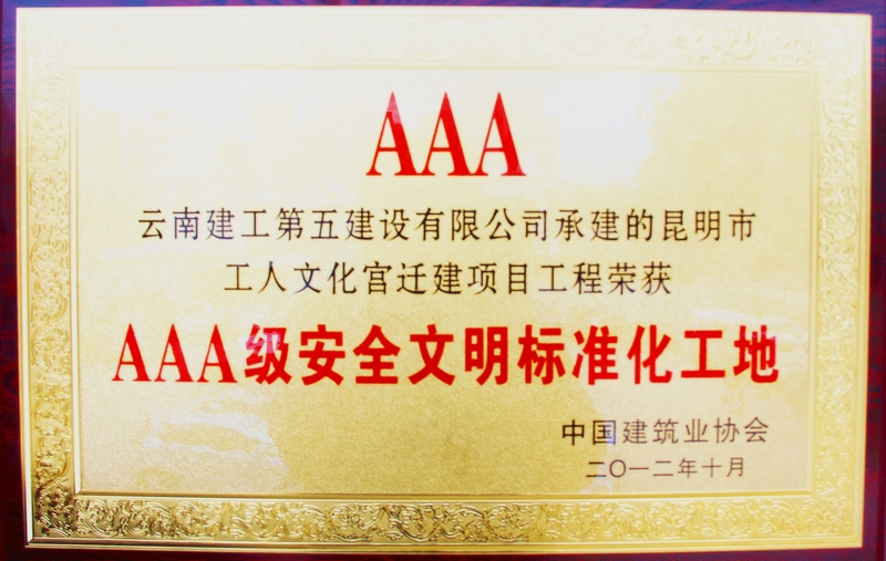 公司承建的昆明市工人文化宮遷建項(xiàng)目工程榮獲AAA級安全文明標(biāo)準(zhǔn)化工地