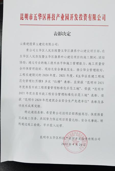 近日,公司收到昆明市五華區(qū)科技產(chǎn)業(yè)園開發(fā)投資有限公司的表彰文件,對第三直管部施工的五華區(qū)人民醫(yī)院暨五華區(qū)康養(yǎng)中心建設(shè)項(xiàng)目表示肯定。文件中指出,五華區(qū)人民醫(yī)院項(xiàng)目在施工期間,通過專業(yè)的施工技術(shù)水平和施工管理能力,使得工程的質(zhì)量較好,施工現(xiàn)場的安全環(huán)保管理情況較好、現(xiàn)場無安全事故發(fā)生、揚(yáng)塵降塵效果較好,在2020年度、2021年度榮獲多項(xiàng)表彰,希望項(xiàng)目部再接再厲,保質(zhì)保量完成施工任務(wù)。 五華區(qū)人民醫(yī)院…