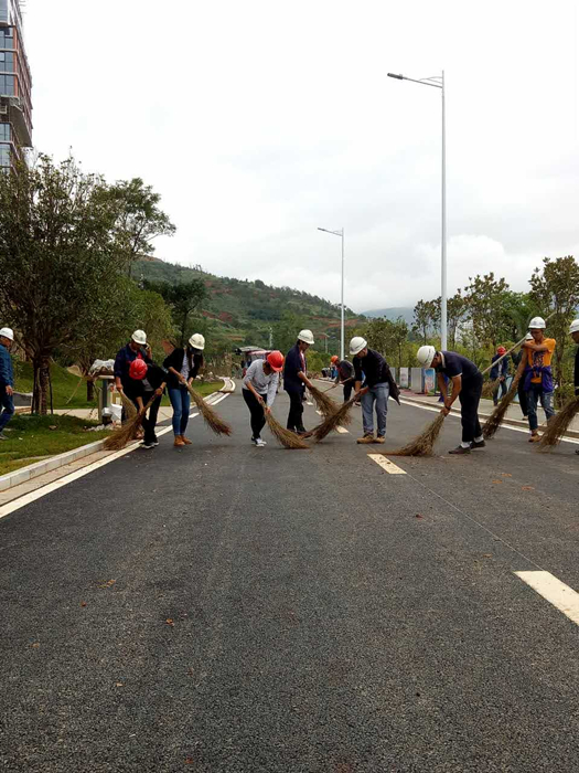 9月是金秋開學(xué)季,新生們滿懷著期待紛紛踏入校園。9月1日,滇西應(yīng)用技術(shù)大學(xué)的管理人員在按照工期節(jié)點(diǎn)圓滿完成任務(wù)的同時(shí),還號(hào)召全體管理人員進(jìn)行義務(wù)清掃,清掃路面積灰、清理碎石碎塊,維護(hù)出入交通秩序,給剛剛?cè)雽W(xué)的新生們一份最好的入學(xué)初體驗(yàn)。 40余名項(xiàng)目管理人員,帶著掃帚、小推車等工具分行分列打掃道路和周邊綠化帶。有背躬著身體...